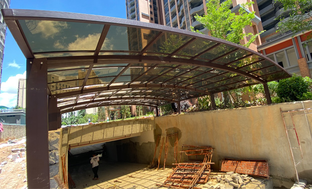 客戶反饋:外觀高端牢固,棚頂有效抵擋紫外線,大大提高了小區(qū)美觀度,同時(shí)停車場看起來更加舒適便利。