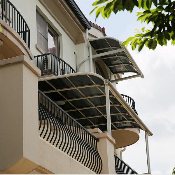 這種雨棚是從2007年日本引進到國內,之前已經在全國有很大的使用范圍,安全性高,材質輕,外觀漂亮。性價比也很高,在別墅區(qū)和自建房中使用的很多。隨著近幾年使用率逐漸增加,鋁合金雨棚也越來越普及,在顏色樣式上更多選擇,設計造型更加美觀。