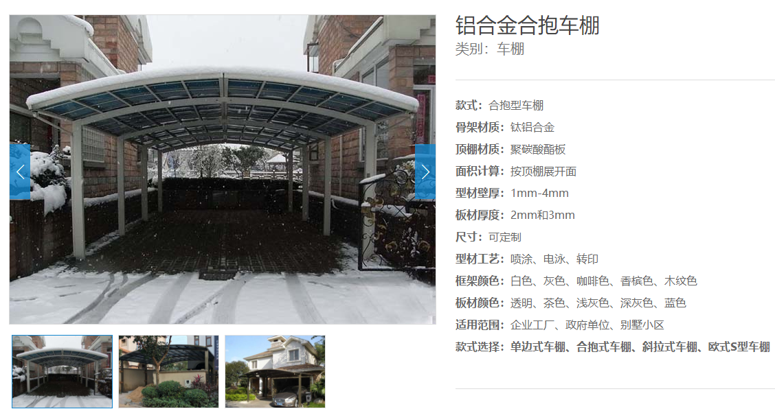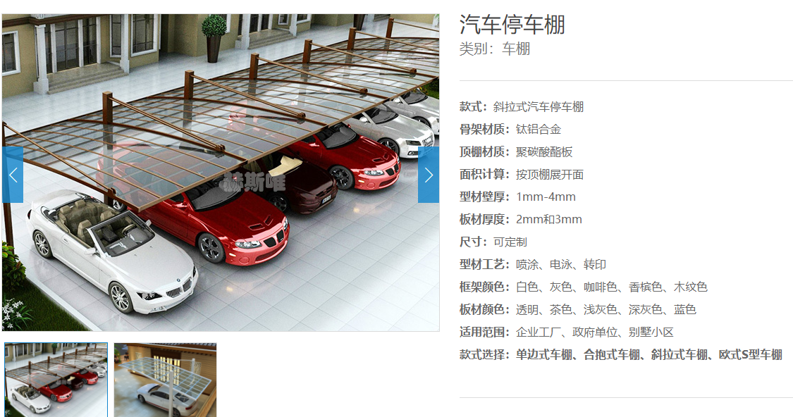 鋁合金車棚以鈦鋁合金為主體骨架,表面噴涂靜電粉末,以達到抗腐蝕的效果,棚頂還采用可以吸收紫外線的聚碳酸酯的面板,可以很好地保護汽車。