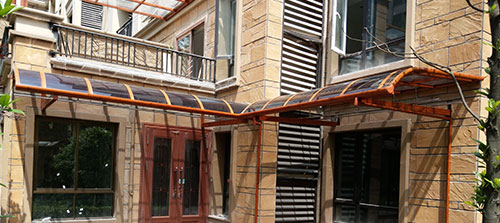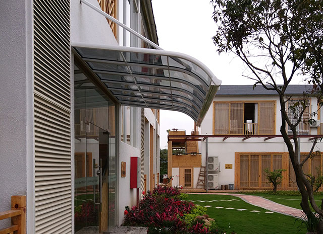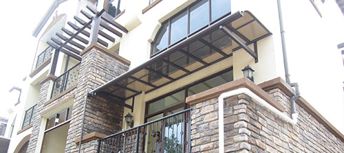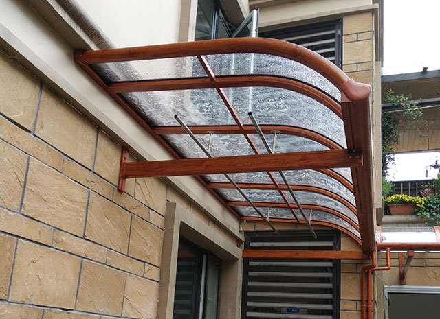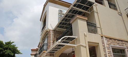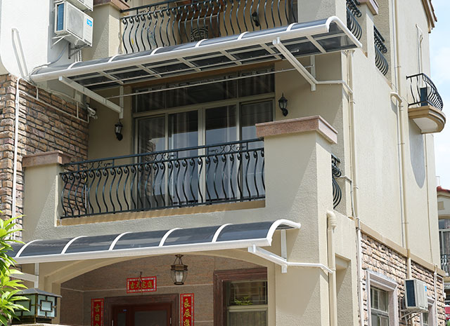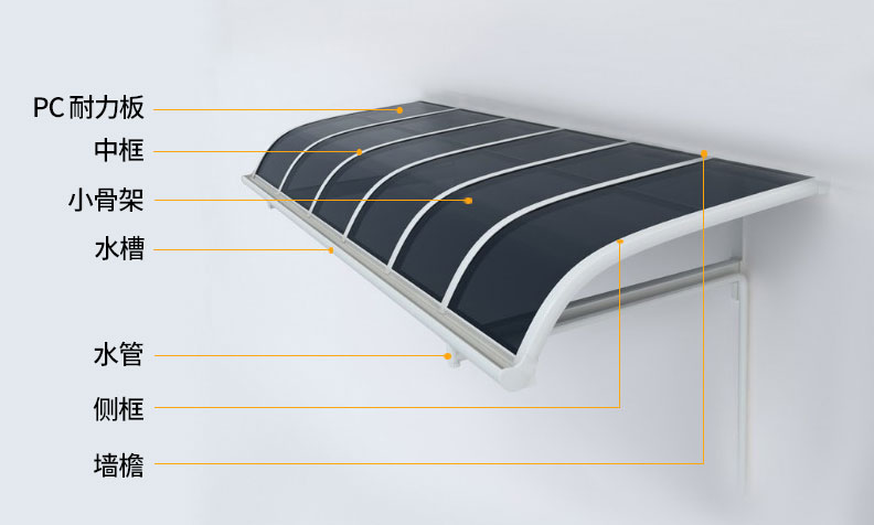 頂棚采用進(jìn)口聚碳酸酯板,抗沖擊比玻璃強(qiáng),有效防止高空墜物