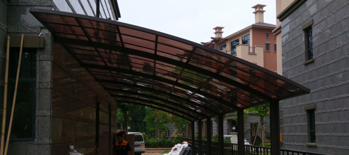 鋁合金停車棚頂棚采用進(jìn)口聚碳酸酯板,抗沖擊是玻璃的數(shù)百倍,有效防止高空墜物